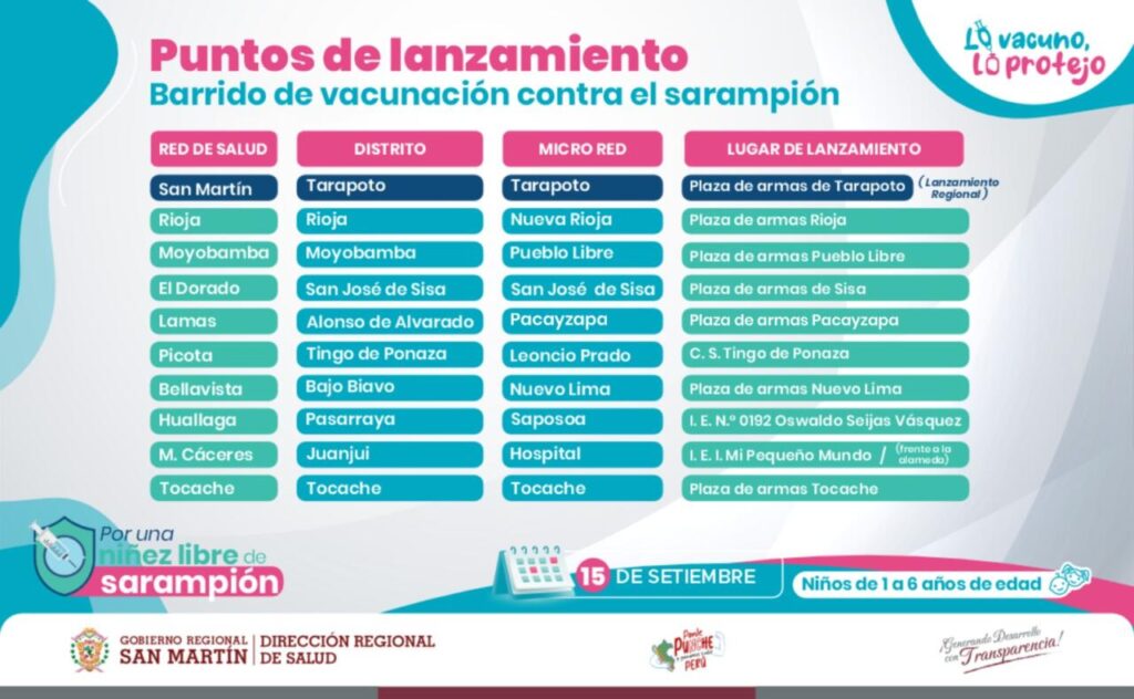Se desarrollará en todas las provincias de la región San Martín Bajo el lema “Por una niñez libre de sarampión”, el Gobierno Regional de San Martín que preside Walter Grundel Jiménez, realizará –este domingo 15 de setiembre– el lanzamiento del “Barrido de Vacunación contra el Sarampión” en todas las provincias de la región. Los puntos […]