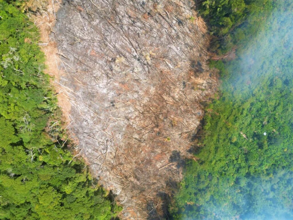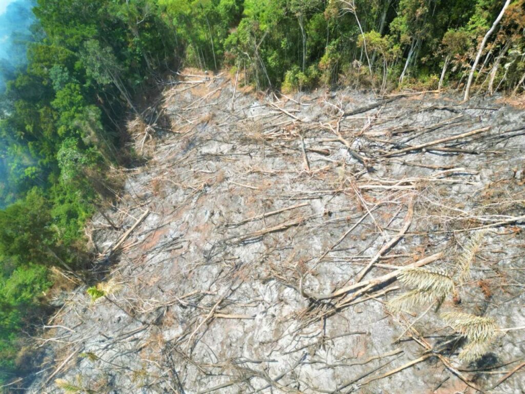 La zona afectada es de aproximadamente 02 hectáreas, en el cual se pudo evidenciar árboles talados de la especie cumala, leche caspi, etc. Además, por las características del área colindante y los árboles que se encuentran alrededor se trataría de un bosque primario.