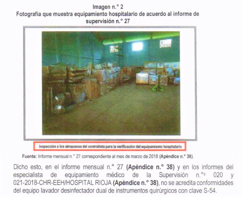 La Contraloría General detectó un perjuicio económico y presunta responsabilidad civil en cinco exservidores del Gobierno Regional de San Martín debido a irregularidades ocurridas durante la ejecución del proyecto de mejoramiento de los servicios de salud y equipamiento del Hospital II-1 de Rioja, el principal establecimiento de la provincia, que atiende una población de más de 130 mil habitantes.