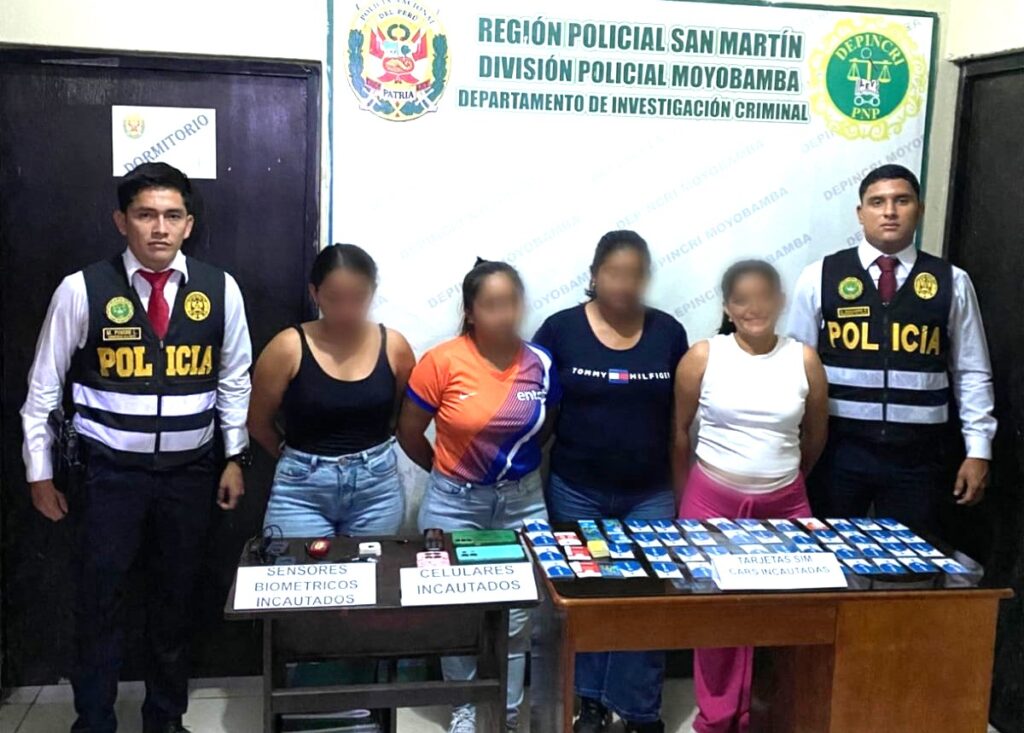 Durante el operativo, el personal policial intervino en la plaza de armas de Soritor, logrando la detención de Emilsa Flores Maluquis (32), Gisela Flores Maluquis (29), Ketty Paola García Yumbato (32) y Clarissa Maluquis Rojas (29). En la acción se incautaron 97 tarjetas SIM de diferentes operadores, seis lectores biométricos y cinco equipos celulares, presuntamente utilizados para actividades ilícitas.